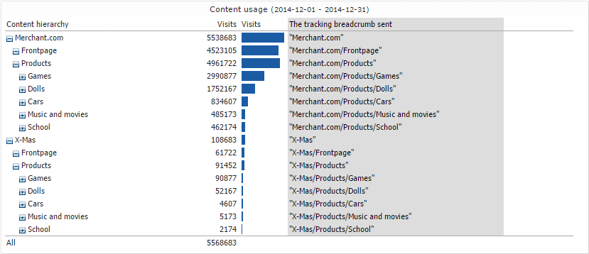 In this case it's easy to see that the Merchant.com/Products section has had 4961722 distinct visits. These visits are the total distinct visits done in this section. Distinct visits means that if a visitor visits both the Games and the Cars section he og she still counts as a single visit. The visit count (4961722) includes all the sections below Products even sections not included in the top 5 rows presented here. The analytical term for this process is called a roll-up. It's extremely practical to roll-up data bottom-up, since you get knowledge of what percentages a lower level section contributes to in the overall result.